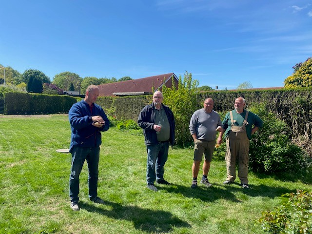 Billede fra baghaven af Brian L. Petersen, afdelingens inspektør, Erling Jürgensen fra organisationsbestyrelsen, malermester Per Wolff og Thomas Preuss fra TR Byg.